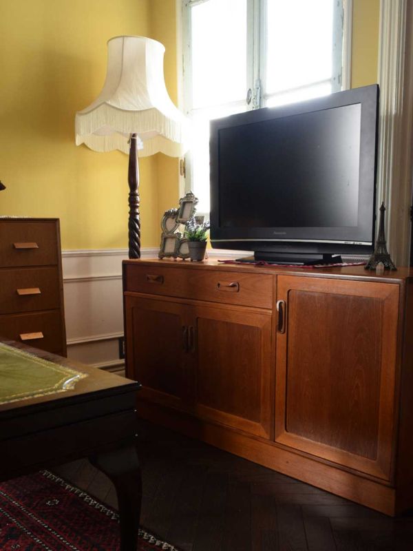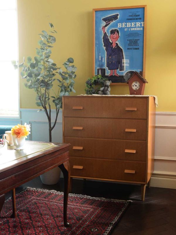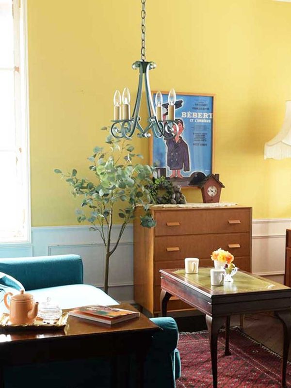 今日は、ビンテージ家具を使って、北欧スタイルのリビングをコーディネートしてみました。 テレビボードとして使うサイドボードとチェストをこんな感じで並べると、スッゴクカッコいい!今日のテーマカラーはブルーなので、青いシャンデリとマリーを組合わせて置いてみました。 イエロー色の壁に絶妙に似合っている姿が、これまたいい感じ!こんなお部屋でゆったりくつろぎながら、今夜はテレビを見る時間を楽しもうと思います。