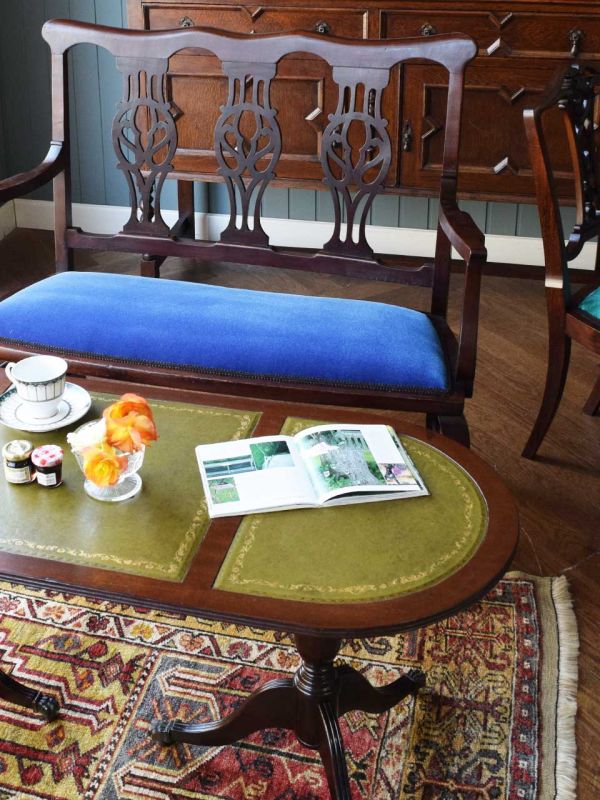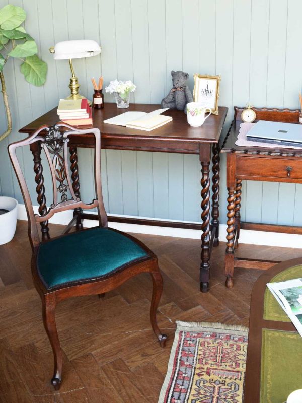 ちょうど高さがピッタリの小ぶりなコンソールをデスクのサイドテーブルとして隣に置いてみました。セティに座って休憩をしながら、買い付けの相談がオンラインでやってくるのを待っています。