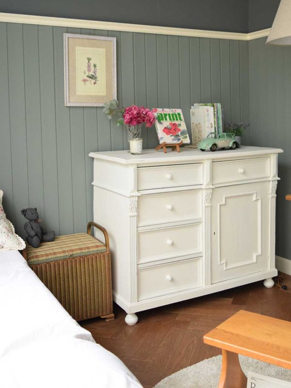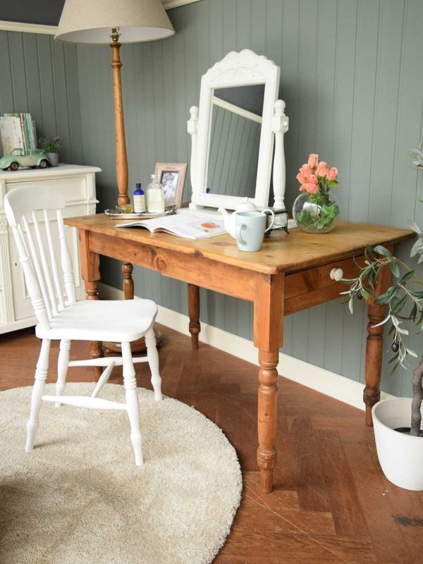 今日から10月。長い夜、本を読みながら過ごしたい私の寝室を、大好きなナチュラルアンティークの雰囲気でコーディネートしてみました。 実際に私が使っているように、デスクとして使っているオールドパインのテーブルの上に、白い置き型のミラーをセッティングして、ドレッサーに早変わりさせてみました 普段、デスクとして使う時は、ペイントのキャビネットの上に乗せてある鏡を、お化粧するときだけデスクに持ってくる、リアルなくらい私の使い方。いかがでしょう??