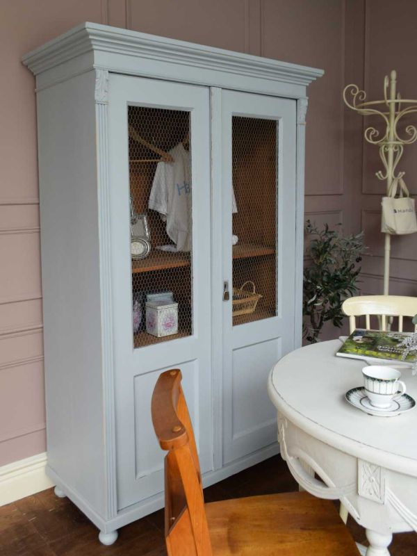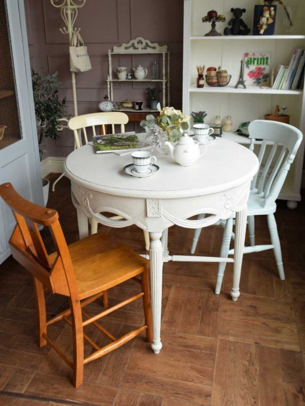 今夜のゴハンは実家の母の希望でフレンチ。いつも温かく迎えてくれるお店をイメージして、フレンチ色のナチュラルなダイニングをコーディネートしてみました。 ペイントのアンティーク家具って、やっぱり好き~!白とブルーグレイの大きなキャビネットを基調に、丸いテーブルを真ん中に置いて、周りをグルっとキッチンチェアで囲んでみました。 ポイントにチャーチチェアを1つ入れて完成!あぁ~今日の夜ご飯が楽しみです!