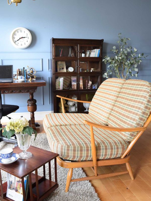 朝早く起きて、遠足に出かける末っ子のお弁当作りから始まったので、お昼ご飯を食べたら、なんだか眠い気がする・・・(笑)でもやることは溜まっているので、しっかり仕事する書斎をコーディネートしてみました。 デスクに使ったのは、立派なバルボスレッグのドローリーフ。よく見かけるオフィス用の回転チェアを組合わせても、テーブルの存在感が大きすぎてテーブルにしか目がいかない~(笑) 隣に大好きなスタッキングブックケースを置いて本棚に。秋色チェックのアーコールのソファに座って外を眺めていたら・・・寝そう~(大笑)