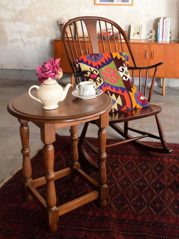 今日は一年に一回のクリスマスリースを作る日。今年はどんなリースかな?と楽しみにしながら、ほっこり過ごす北欧スタイルのリビングをコーディネートしてみました。 今日の主役は・・・クッション☆一番最初に目に飛び込んでくる色使いが鮮やかなオールドキリムのクッションはお部屋のアクセントにピッタリ~! ホットカーペットを下に敷いたトライバルラグに、天板がタイルになっているおしゃれなローテーブルを置いたら、まるでこたつのような雰囲気(笑)さぁ、ガンバってクリスマスリースを作り、はじめま~す!