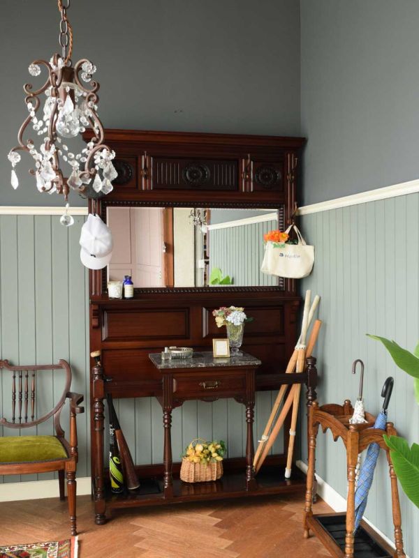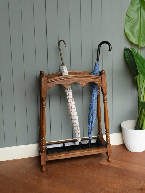 英国紳士のおしゃれアイテムを置く、ステッキスタンドを傘立てにした玄関