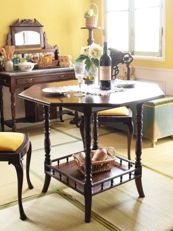 すっごくゴージャスな背もたれのサロンチェアが運よく2脚、お揃いであったので並べて、運気が上がりそうな八角形のテーブルの周りを囲んだちょっと豪華バージョンのサロンセット。