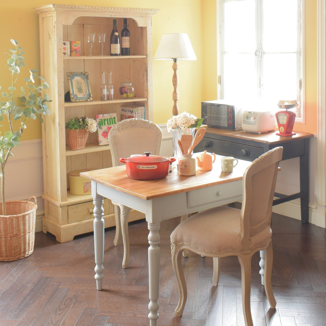 スッゴクお天気がよくて気持ちがいいので、気分があがるペイントの家具を使ってダイニングをコーディネートしてみました。 今はめったに見かけなくなってしまった、オールドパインのバタフライテーブルを開いてダイニングテーブルにして、いろんな色のロイドルームチェアを組み合わせてみました。 壁面には作業台として使うウォッシュスタンドとブルーグレー色がキレイなオープンキャビネットを。みんなでテーブルを囲んで、何を食べようかな??