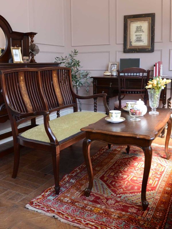 こういう部屋におススメしたいミラーバックサイドボードの前にセティを置いて、フレンチスタイルのコーヒーテーブルを。下にシバスの絨毯を敷いただけで、なんだか高級な座談会スタイル(笑)