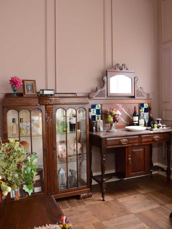 大きなワードローブを食器棚に使う、英国スタイルのダイニング