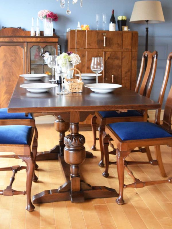 今日の夜は主人が新年会に行くので、末っ子と2人の母と4人でお好み焼きパーティー。ホットプレートを囲んでお好み焼きを作るダイニングをコーディネートしてみました。 ホットプレートを乗せるダイニングテーブルに選んだのは、ちょっと大きめサイズのめずらしいドローリーフテーブル。両方のリーフを開いてみんなで囲むのにちょうどいいな・・・と思いながら、ブルー色の座面のクイーンアンチェアを組合わせてみました。 杢目が美しいキャビネットとコンパクトムを置いておしゃれに仕上がったダイニングで焼くお好み焼き。いつもより美味しく焼けそう~(笑)