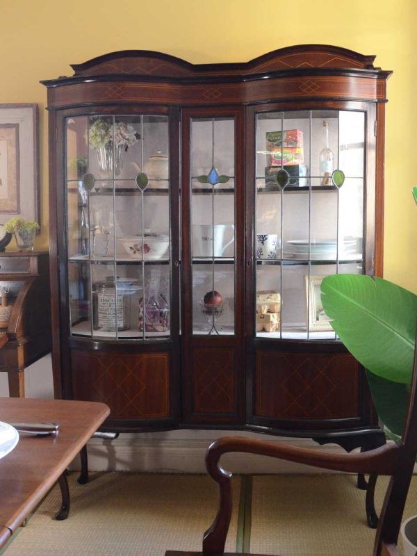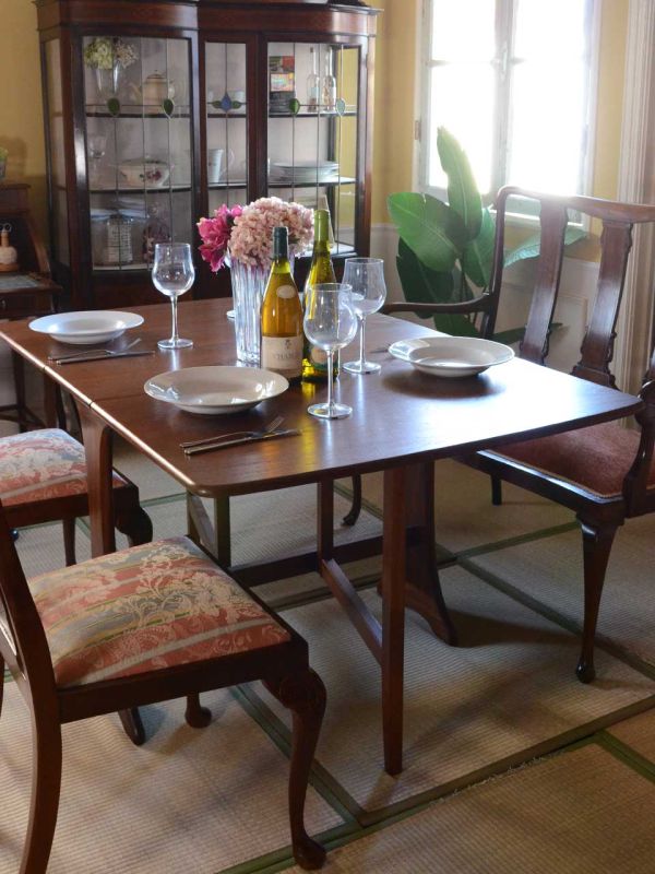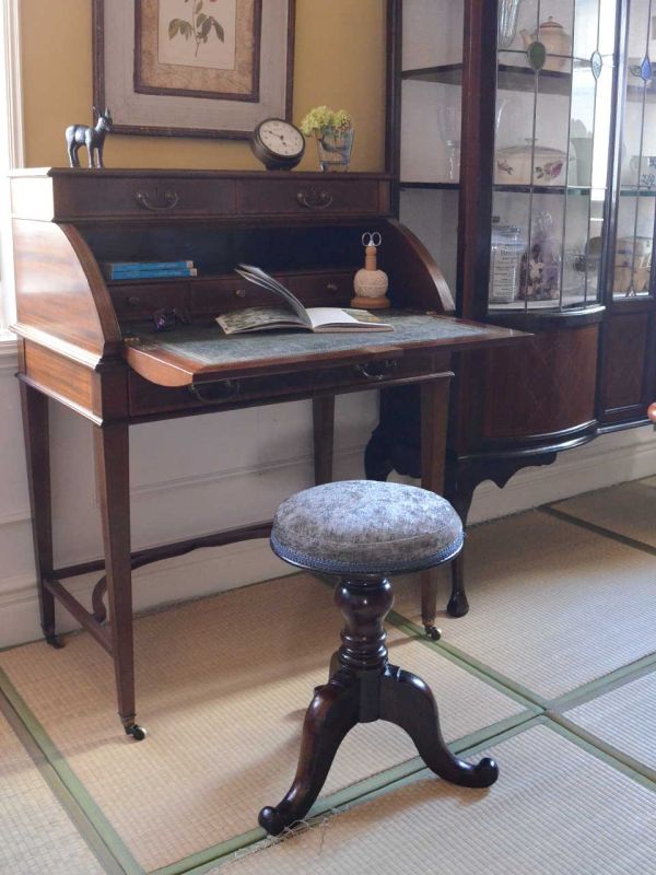 こんな和室で食事をしたら、いつもより美味しそうだな・・・と思いながらコーディネートしたアンティーク家具×畳コラボのダイニング。 畳とクイーンアンチェア&セティの組み合わせがあまりに似合っていて、見ているだけでワクワクする~!地震でビクともしなかったステンドグラスのキャビネットを壁面にドーンと置いて、隣には足が細いテーパードレッグのデスクを。 クラシックスタイルのアンティーク家具が、こんなに和室に似合うなんて・・・と正直ビックリしながら、これから先、この組み合わせにハマりそうです(笑)