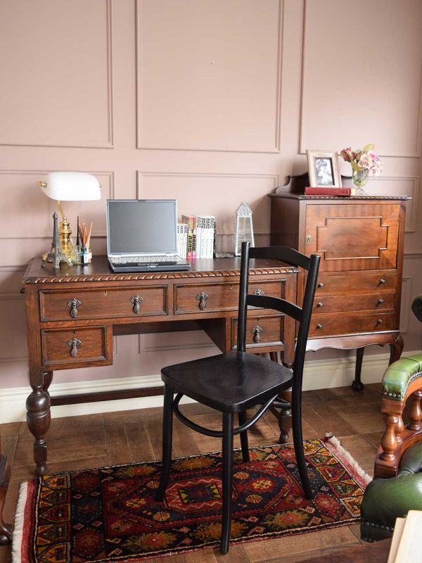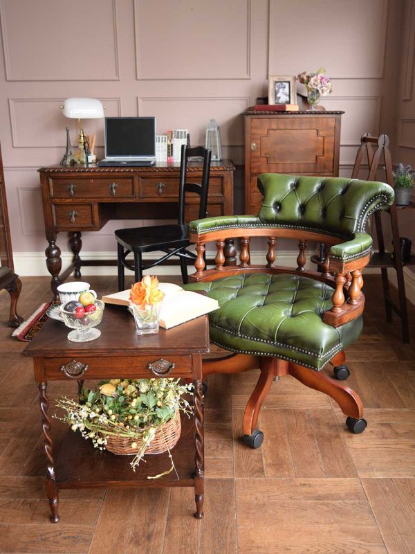 仕事用にバルボスレッグのライティングデスクを置いて、隣にはミュージックキャビネットを。ゆったり座れるチェスターフィールドのリボルビングチェアを設置してみました。