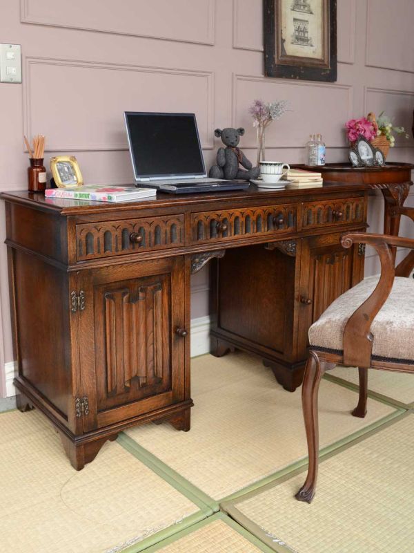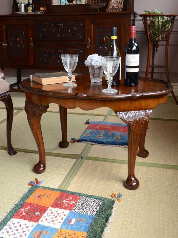 今日は朝から雪。冬に逆戻りしてしまったな・・・と思いながら、こたつに入りたい気分で和室をコーディネートしてみました。 大きなミラーが付いたミラーバックサイドボードと、リネンフォールドのデスクの組み合わせが最高にカッコいい~!チッペンデールのアーム付きチェアと組み合わせて、畳の上にギャッベを座布団にしてみました。 畳とオーク材の家具のコラボが最高にカッコいいな・・・と眺めながら、座布団を枕にゴロン。こたつに入って、お昼寝したい気分デス。