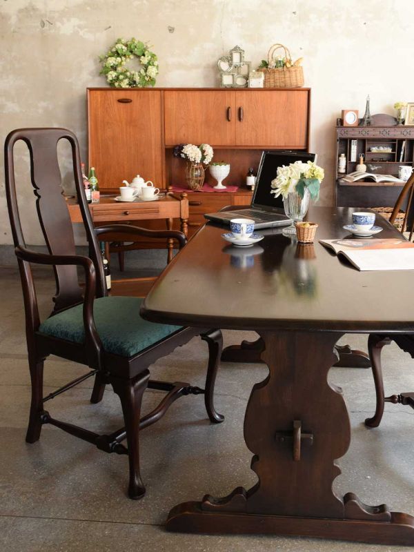 今日は北陸新幹線が福井にやってくる日。100年に一度の大イベントらしく、たくさんの人でにぎわう中、私は名古屋に車で移動。ひつまぶしを食べたいなと思いながら、ダイニングをコーディネートしてみました。 せっかく食べるんだったら王様気分で食べたいな~と思って選んだアーム付きのクイーンアンチェア。アーコールのテーブルに組み合わせてみたら、まるでセットみたいにピッタリ☆ デザインがシンプルなので、ビンテージの家具と組み合わせてもすごくよく似合うクイーンアンチェア。憧れる~!