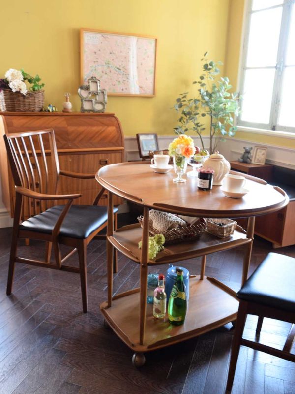 今日で4月も最終日。なんだか1カ月が早いな・・・と思いながら、大好きなアーコールのワゴンテーブルを使ったビンテージスタイルのお部屋をコーディネートしてみました。