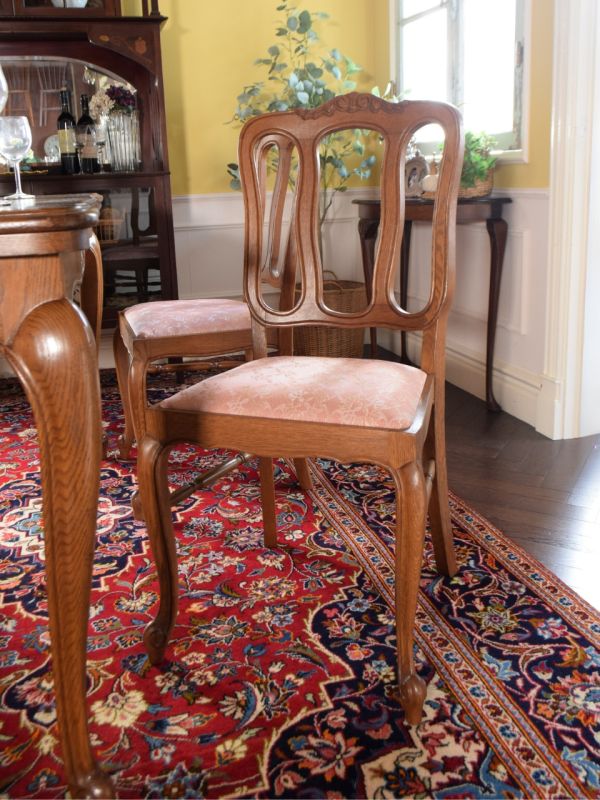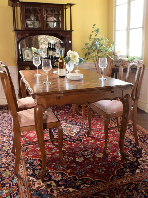 出来上がったお部屋を見て「めっちゃ豪華☆」と自画自賛してしまった今日のスタイリング(笑)久しぶりに届いたフランスのドローリーフテーブルを使ったダイニングをコーディネートしてみました。 なかなか見つからなくて、やっと届いたDLTが嬉しくて、一緒にパーラーを組合わせてみたら、イギリスとフランスの家具同士が仲良くコラボしているみたいで雰囲気がいい~! このお部屋を一番盛り上げてくれているのは・・・オールドペルシャ!赤と青も伝統的なペルシャ模様でお部屋の中に花が咲いたような雰囲気です。