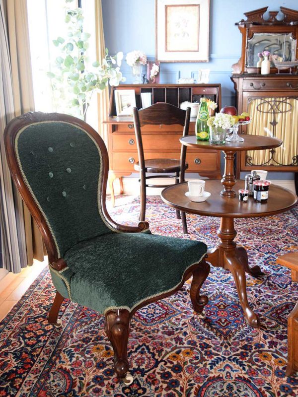 遠足に出かけた末っ子のお弁当を作り終わって、仕事までの時間を過ごすチェスターフィールドを使ったリビングをコーディネートしてみました。 最近、大人気のチェスターフィールドのソファは、置いただけで一気にお部屋の雰囲気がカッコよく決まるんだけど、ペルシャを敷いたら、チェスターフィールドが負けちゃうくらい華やか(笑) 存在感が大きな2つと一緒に組み合わせたマホガニー材の家具たちがキラキラ輝いて見えて、なんだか朝から気分がいい~!
