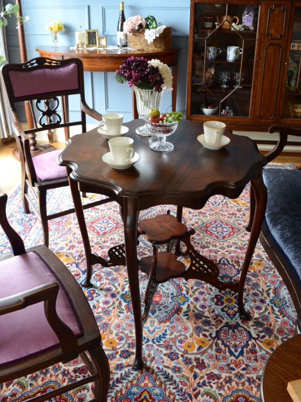 今週末のコンペに向けて、毎日、練習に行っている私。コンペが終わった後、こんなサロンでゆったりくつろぎたいな・・・と思いながらサロンをコーディネートしてみました。 透かし彫りが美しいセティ×サロンチェア、そこにオケージョナルテーブルを加えてみたら、なんだか貴族気分で気持ちがいい~(大笑) さらに絨毯を加えてみたら、まるでお花畑の上にいる気分!いわゆる昔の応接室だけれど、椅子が違うだけで昭和の応接室とは全然違って、満足度が高いです。