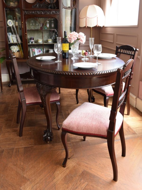 めったに見つけることが出来ない、クイーンアンスタイルのエクステンションテーブルが目に入ったので、今日はこの子と一緒に過ごすダイニングをコーディネートしてみました。 このテーブルに似合うのは…コレ!と選んだ美しいパーラー。一緒に組み合わせる椅子もかなり悩んだけれど、めったに見ない背もたれのデザインが気に入った椅子を合わせてみたら、これもなかなかいい感じ! ここにいるだけで気分が上がっちゃうな~って、ワクワクしながら過ごす時間。すっごく楽しい♪