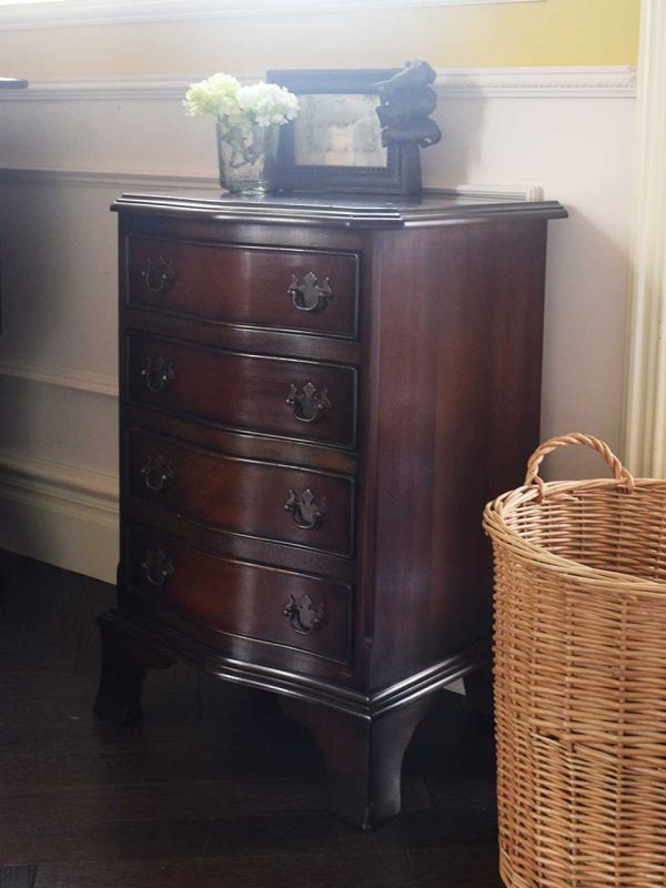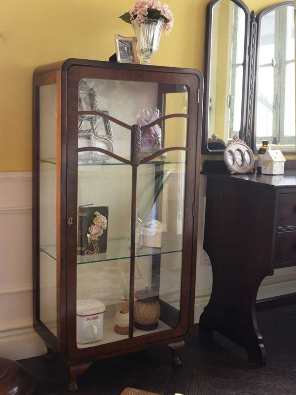 夜中、いつ目が覚めてもテレビが見れるように、1人掛けの椅子を寝室に置いて、ネストテーブルを設置。壁面には大きな三面鏡のドレッサーとお気に入りのショーケースを並べました。