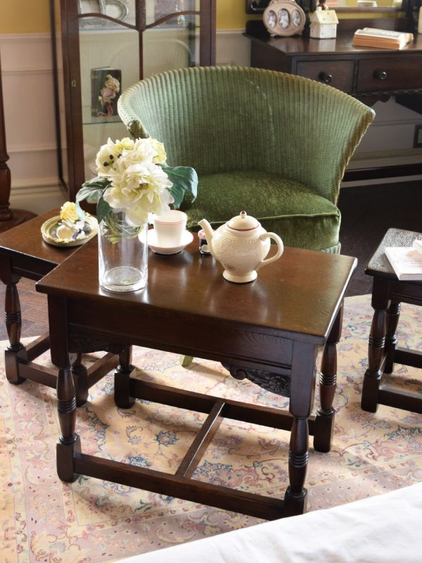 小さな双子のテーブルをを引っ張り出して使えるネストテーブルは本当に便利!椅子に座ってテレビを見ながら、今日も勇気をもらっています。