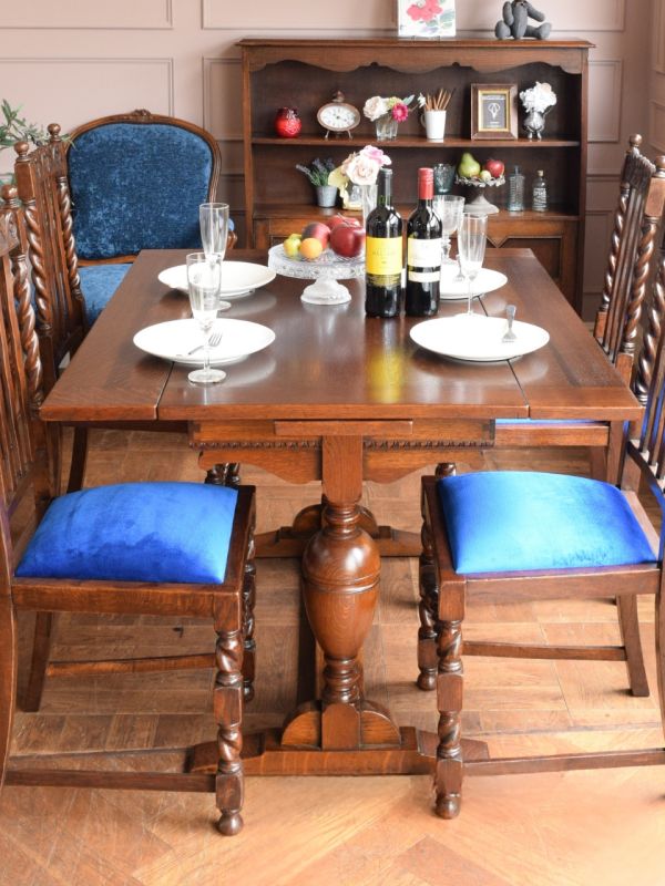 今日も野球の大会に向けて三重に出かけた末っ子。今頃、どうしているかな・・・と寂しく思いながらご飯を食べるダイニングをコーディネートしてみました。 実は広げ方がいつもと違う、バルボスレッグのダイニングテーブル。ツイストの椅子を組み合わせて、分かりやすい英国アンティークスタイルのダイニングに仕上げてみました。 座面の色を爽やかなブルー色でセレクト。夏仕様の英国ダイニングで、大人だけの夜ゴハンを楽しもうと思います。