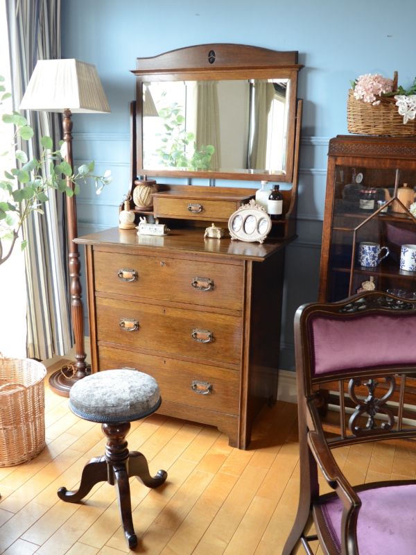 夏休みも終盤。今日はお客様からご要望を頂いて、英国スタイルの寝室のコーディネートをご紹介します。 たっぷりの引き出しが付いたチェストの上に鏡を乗せた形のドレッシングチェストと、シノワズリスタイルのガラスキャビネットを隣同士に並べた壁面。 超お気に入りのパープル色の生地を貼って高級な雰囲気に仕上がったアームチェアと、ベッドの足元に置いたタブリーズのカーペットのコラボがすっごくいい感じ!寝室を豪華な雰囲気で包み込んでくれています。