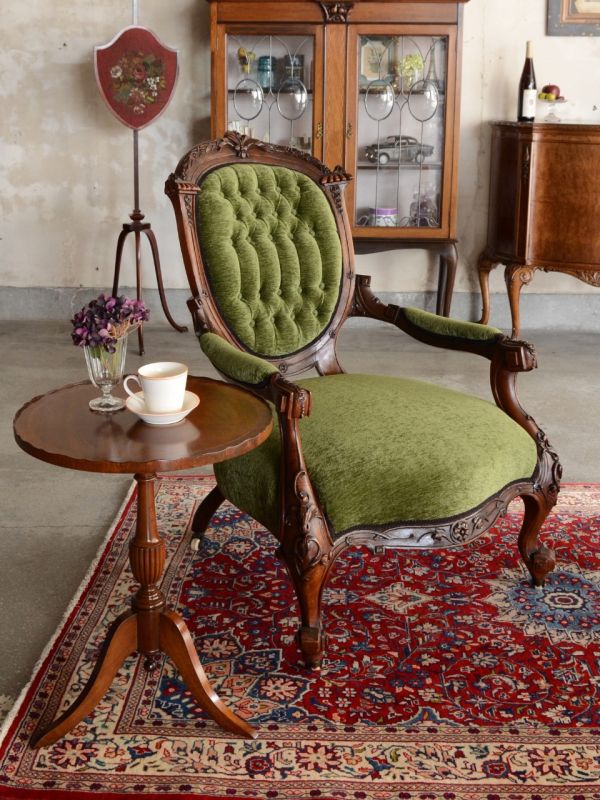 今日はお揃いのナーシングチェアを組合わせて、サロン風のお部屋をコーディネートしました。 実際に、こんなお部屋で過ごせたら・・・と超憧れる~(笑)アーム付きとアームなしをお揃いで置いて、それぞれにワインテーブルを設置。男性用と女性用って感じがして、すっごく雰囲気がいい~! 真っ赤なペルシャを敷いて、さらに贅沢気分。ここに座ってお茶を飲みながら話を楽しみたいな・・・