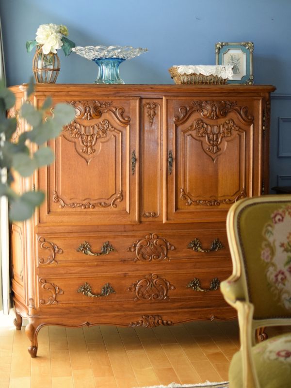 今日は18日なので今月のスタイリングの日。先日、到着したばかりのフランス便の中から、とっておきのキャビネットを選んでコーディネートしてみました。 マンションサイズのLDKをイメージして、フランスのアンティーク家具で揃えたお部屋は、全部の家具のテイストが揃っているので、豪華絢爛な家具ばかりが集まっているのに、なぜだかスッキリ見える~! 気持ちいい秋風を感じながら、猫足の家具たちと過ごすLDK。ぜひチェックしてください。