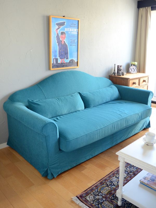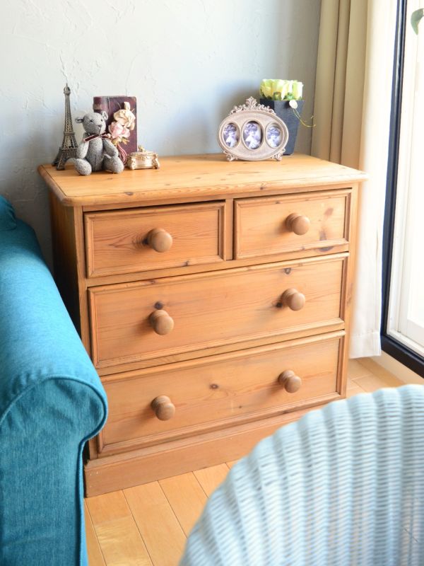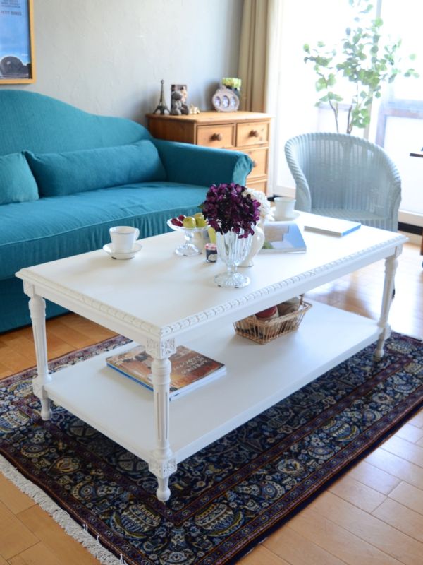 外は大雨。久しぶりにゆっくり寝ることが出来て、頭もスッキリ☆朝から普段の生活にリセットして過ごす仕事をするリビングをコーディネートしました。 サイドテーブル代わりに使ったのはオールドパイン材のチェスト。この子の形、めっちゃくちゃ可愛い~!アーコールのカクテルキャビネットをビューロー代わりに使って、白いロイドルームをデスクチェアにしてみました。 白いアンティーク調のローテーブルの存在感もスゴイ~!私好みの爽やかな色合わせ。気に入っています。