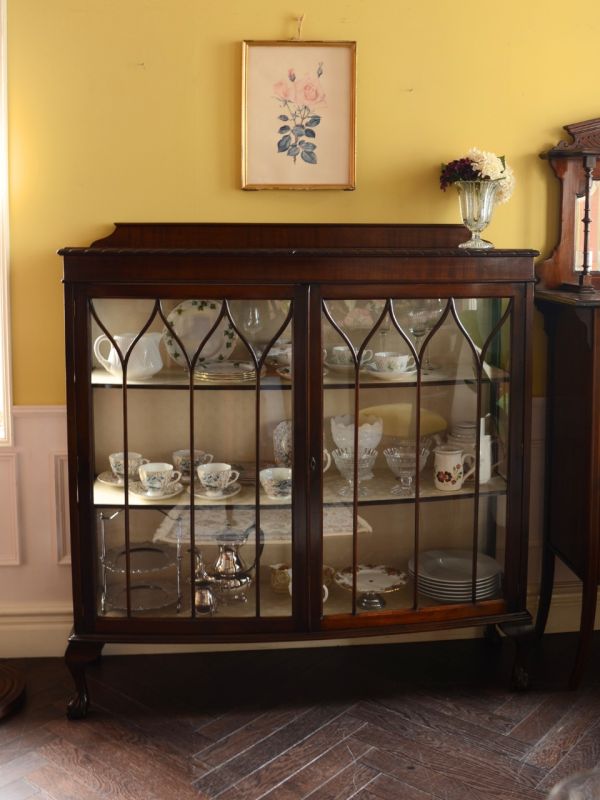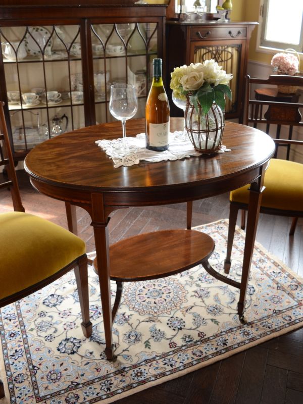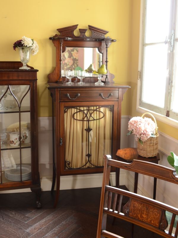 選んだのは、間違いがない!と自信マンマンにおススメする定番ポインテッドアーチのガラスキャビネット。お隣にミュージックキャビネットを置いて壁面がカッコよく決まったので、小さなオケージョナルを花台に、大きなオケージョナルをティーテーブルに。