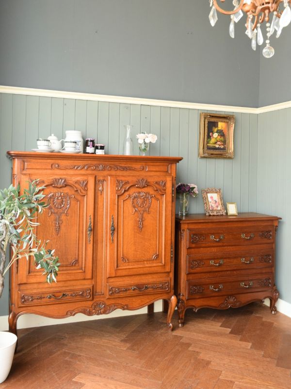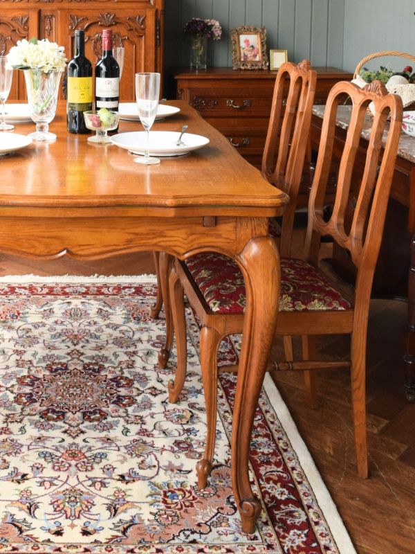 今日から主人が東京。留守をあずかった私は、よりにもよって予定が詰まっていて大忙しすぎる~・・・ということで、今日の夜ゴハンはカレーに決めて、ゆったりと食べれるフレンチスタイルのダイニングをコーディネートしました。 猫足が優雅なダイニングセットとお揃いのキャビネットとチェストを壁面に。作業台に使いたいなとウォッシュスタンドを実用性とアクセントを兼ねて置いてみました。 座面の模様に合わせてペルシャ絨毯をセレクトしたら、まるでお揃いみたいにピッタリ!今日のカレーはフランスの味がしそうです(笑)