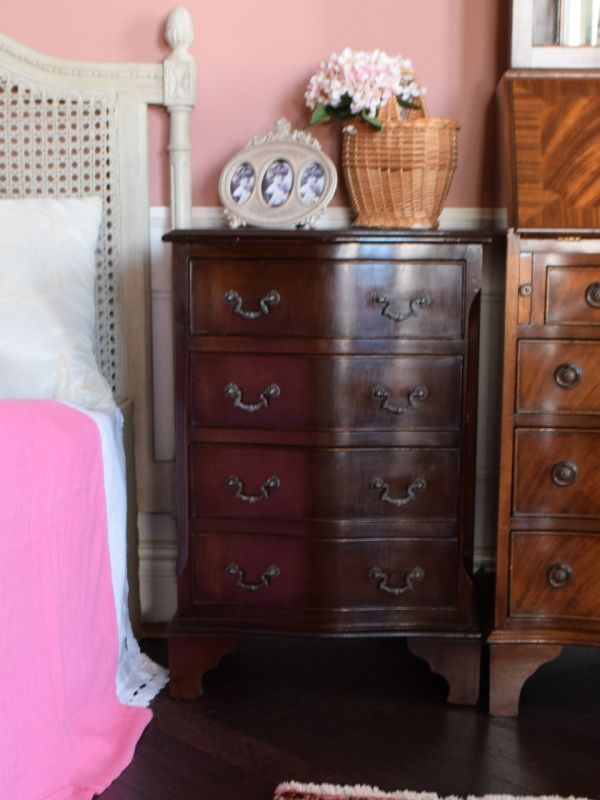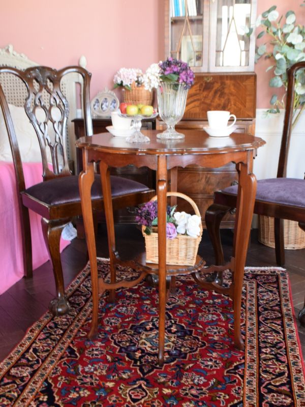 最近、倉庫に行くと目が合うビューローブックケース(笑)私をスタイリングに使って!と言っているみたいなので、この子を使って寝室をコーディネートしてみました。 美しいビューローブックケースに組み合わせたいなと選んだチッペンデールチェア!背もたれのデザインがとってもエレガントで、見ているだけでため息が出ちゃう~(笑) 丸いサイドテーブルを中心に、両脇にチッペンデールを置いて、中心にそびえ立つビューローブックケース。この子と目が合ってよかった!(大笑)