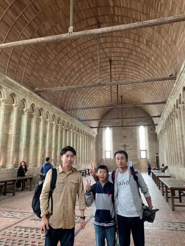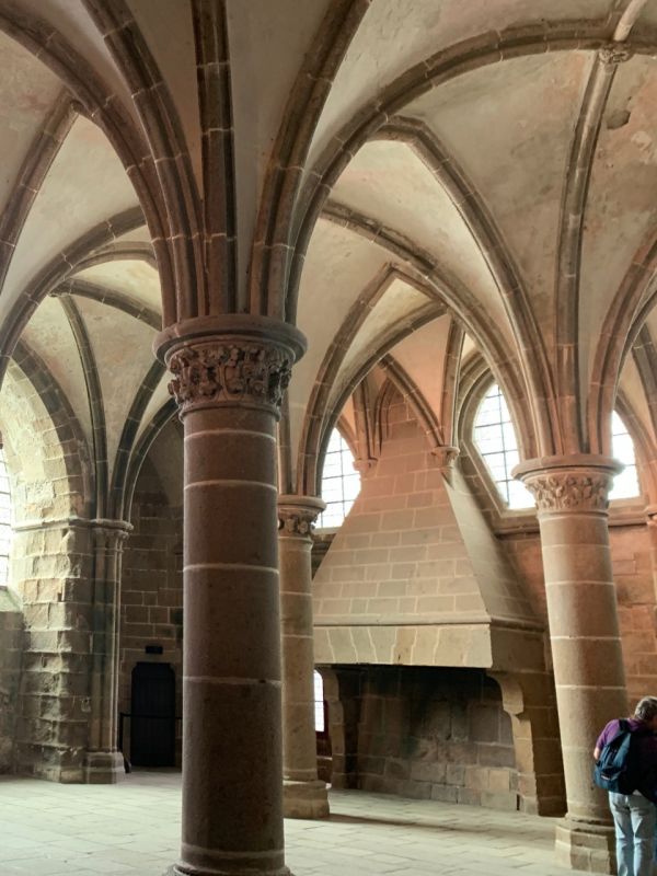 いきなりグリーンが現れたここは、1228年に修道士の居住空間として建てられた、三層構造のゴシック様式の建築「ラ・メルヴェイユ」 2本1組の柱が少しずつずれて建てられた回廊は、永遠に続いているような不思議な錯覚を生み出すので、修道士たちはここを歩きながら瞑想にふけっていたそうです。 ちなみに、このグリーンの場所には薬草が植えられていて、巡礼者の治療なども行なっていたそうです。 そしてアーチ型の天井が美しい修道士たちの食堂。ここではおしゃべりは禁止!聖人の生涯を朗読する声だけが響き、静かに耳を傾けていたそうです。