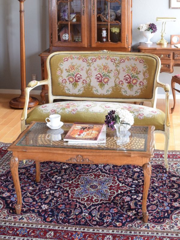 今、ペルシャ絨毯の特集を作っていて、すっかりハマってきている私。ペルシャとプチポワンをコラボしたら、どんな雰囲気になるんだろう??と思って書斎で組み合わせてみました。 フレンチスタイルのキャビネットを本棚として使って、隣にデスクを置いたおしゃれな書斎。一息する場所にプチポワンのセティを置いて、ペルシャ絨毯を敷いたら、まるで花が咲いたような雰囲気(笑) 色が被らないように選んだので、どっちも甲乙つけがたい…一つ問題があるとすれば、神々しすぎて座れない…(大笑)