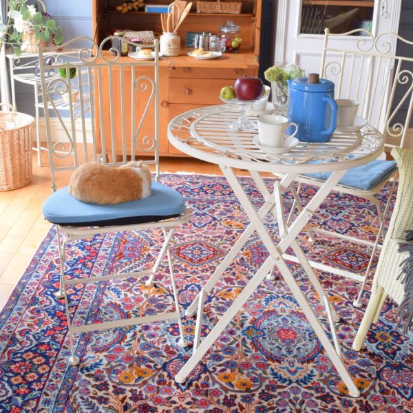 ペルシャ絨毯の記事を書くのに詳しく調べていたら、今まで以上に好きになってしまった~!この感覚って、アンティーク家具を知った時と同じだなと思いながら、ペルシャが主役のダイニングを作ってみました。 見つけた時に「コレっ!」て選んだお花の模様がたっぷり入ったヤズドの絨毯。ディーラーに褒められたくらいディーラーもイチオシのめずらしい絨毯を敷いただけで、まるでお花畑にいるみたい!(笑) 白と水色をテーマに家具の色調を合わせて、到着したばかりのアイアン家具を組み合わせたら完成。いい香りがしてくるみたいで、なんだかすっごく気持ちいい~