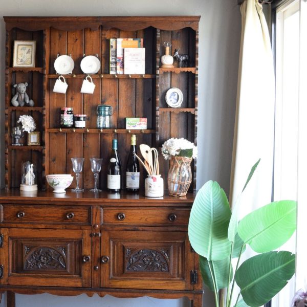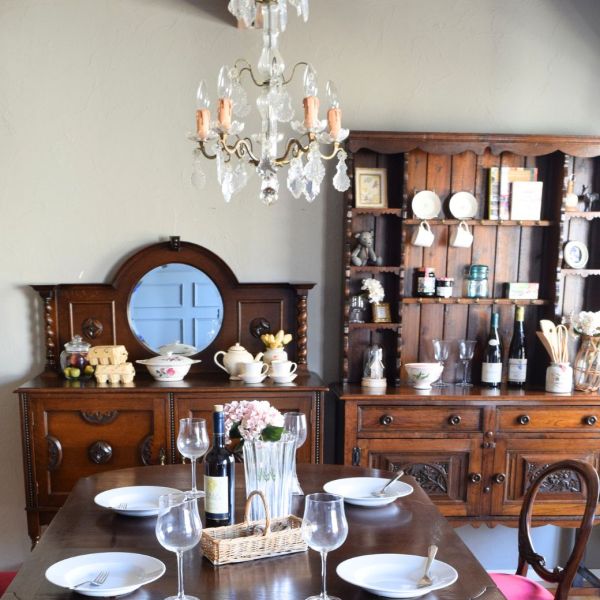 大きなワードローブを食器棚に使う、英国スタイルのダイニング