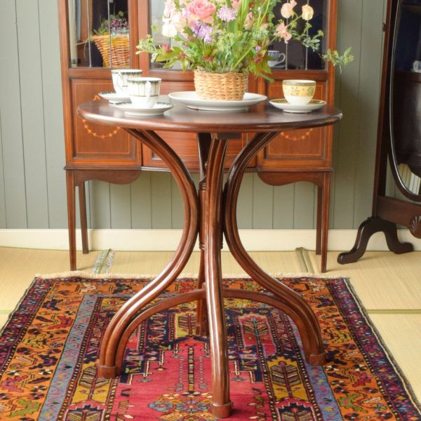ベントウッドの丸いテーブルを置いて、ブランケットボックスをベンチ代りに使ってベントウッドチェアと組み合わせた朝食コーナー。ステンドグラス扉の飾り棚を眺めながら食事をすると、ちょっとリッチな気分(笑)