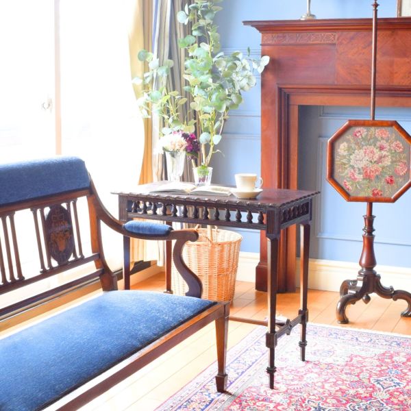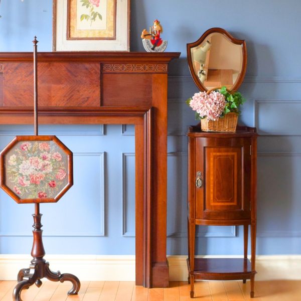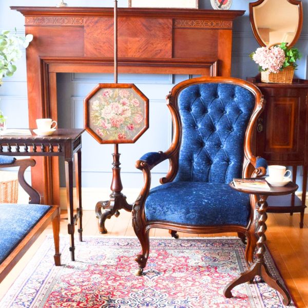 こんな部屋で暮らしてみたいな・・・と思ってマントルピースのあるリビングをコーディネートしてみました。 リビングはマホガニー材がメインのクラシックスタイル、ダイニングはオーク材がメインのアンティークスタイルでまとめたので、お互いが馴染むようにダイニングチェアにクイーンアンを組合わせてみました。 ナーシングチェアの横には、ダイニングテーブルの脚とおなじツイスト脚のワインテーブルを置いて、さりげなく馴染ませたリビングダイニング。このままわが家に連れて帰りたい~!!