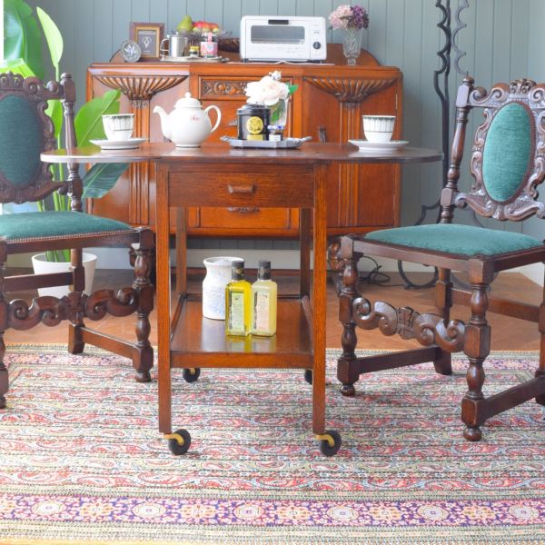 今朝は「ふくい桜マラソン」の応援に行って、その後、久しぶりにゴルフのレッスンに。なんだか疲れてしまったので、小休憩をとるコンパクトサイズのダイニングを作ってみました。 気軽に休憩する時に、すっごく便利そう!と思って選んだのは伸長式のテーブルワゴン。これくらいの大きさって、ダイニングにも使えそうだから自宅でも使いたいな~ エリザベス様式の迫力あるキャビネットとめっちゃカッコいいペイズリー柄のクムのペルシャを組合わせたら、最高☆休憩したらウォーキングに行ってきます!