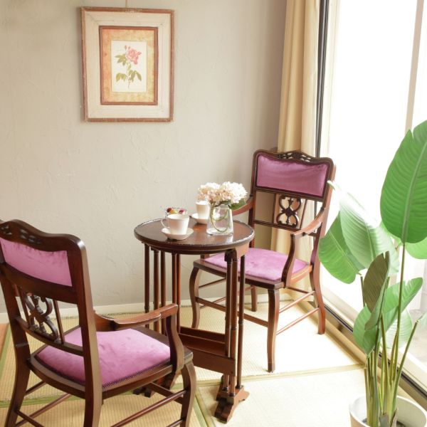 少しずつ桜が咲いてきたので、ピンク色を基調にした和コーナーのあるリビングダイニングをコーディネートしてみました。 窓際の和コーナーで、本当はゴロンっと寝転がりたい気分(笑)だけれど、今日はちゃんと座ってお話しできるよう、エレガントな2脚の椅子と背が高めのネストテーブルを組合わせてティーコーナーを設置してみました。 とは言え、気が付くとピンク色のマリーにゴロンと寝転がって、テレビを見ている…(笑)そんな自分が好きです(大笑)