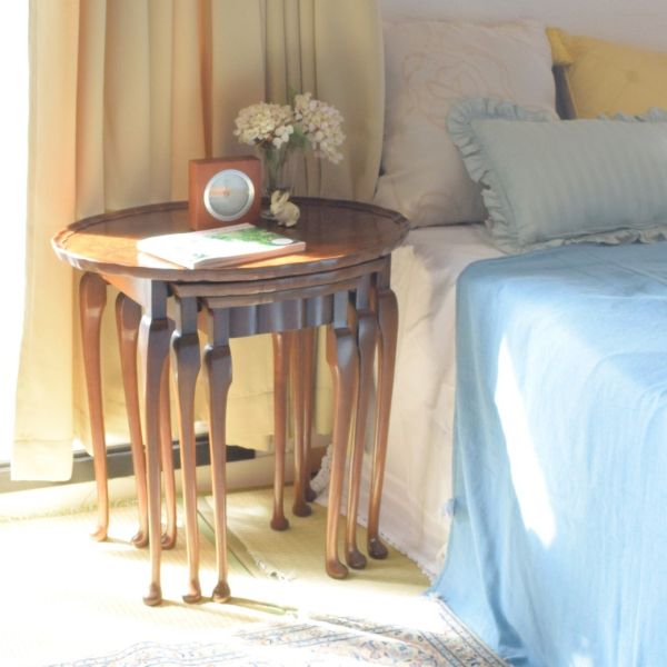 最近、朝早く起きて桜を見ながらの散歩するのが日課。スッキリ起きれる和室の寝室をコーディネートしてみました。 今日の気分は彫!彫!!彫!!!サイズの割に立派なバルボスレッグに彫が入ったアンティークのコーヒーテーブルに似合うよう、デスクと本棚をセッティングしてみたら、畳が良く似合う~!! ここでゴロンと寝転がって日向ぼっこしながら窓を開けたら桜の花びらが・・・あぁ~気持ちがいい!