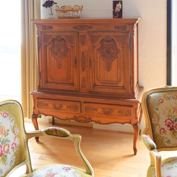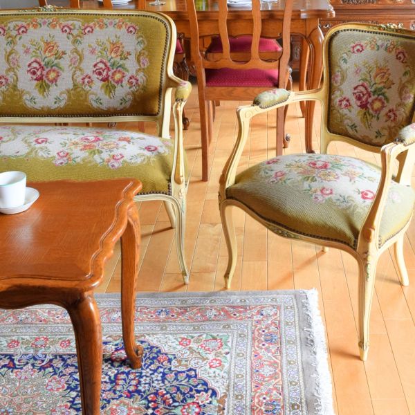 今日はめっちゃくちゃ優雅な気分で過ごす、フレンチスタイルのリビングダイニングをトータルコーディネートしてみました。 注目して欲しいのは・・・足先!全員がハイヒールを履いたようなフレンチカブリオールレッグのお揃いコーデ。色にアクセントをつけたくて、プチポワンのサロンセットを組み合わせたらイイ感じ~ やっぱりフランスの家具って美しいな・・・と彫りの美しさを眺めてうっとり~としている時間が、なにより幸せな時間です(笑)