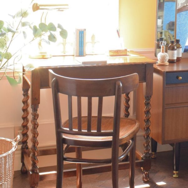 今日はいつもより少し遅く練習に出かけたので、少しゆっくり寝ることが出来た私。心地よく目覚めることが出来た寝室を作ってみました。 ちょうどいい感じのツイスト脚のテーブルを2台見つけたので、一つはデスクに、一つはナーシングチェアと組み合わせて休憩コーナーに。同じツイストで・・・とも思ったんだけれど、ちょっとクールに決めたくなって、G-PLANのトーラ&ブラックのドレッサーを組み合わせてみました。 これがこれが、なかなかいい感じ~!!ツイストとトーラ材の新しいコラボ。ハマリそうです(笑)