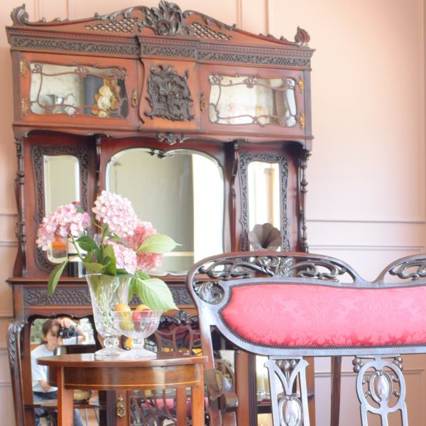 今日で6月も終わり。一年の半分が終わってしまった…梅雨が明けたように暑いので、花壇に咲いている紫陽花をカットして飾ったパーラーをコーディネートしてみました。 美しいパーラーキャビネットとサイドボード、そこにセティを足したパーラーは、それはそれは美しい~こんなお部屋があったら、それだけで毎日が貴族気分だな(笑) 昔の家具職人さんが大切に造ってくれたものを、今、こんな風に使えるって本当にすごいことだなと改めて感じながら、大切に使い続けていけることを幸せに思っています。