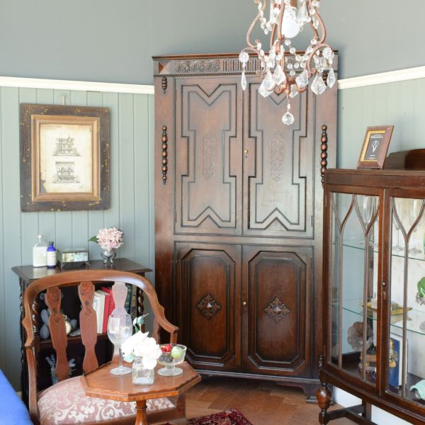 英国クラシックの | 美しい彫が目に飛び込むコーナーキャビネットのある寝室