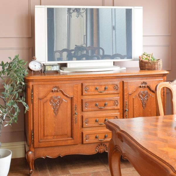 見つけた時からテレビを置きたい!と思っていた、フレンチアンティークのサイドボードにテレビを乗せて、エレガントなダイニングをコーディネートしました。 やっぱりフランスの家具は並べただけでめちゃくちゃ華やか☆カップボードの色をちょっと濃いめのもので合わせたので、逆にメリハリが出てイイ感じに仕上がりました。 カップボードの横に、ツイスト脚のぺディスタルカップボードを置いてメリハリをつけて完成。大きなテレビを見ながら、ガッツリ食事が楽しめそうです(笑)
