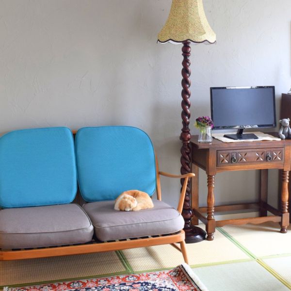 テレビでお宅訪問番組を見ていたら、温泉旅館にいるような気分のお部屋が作りたくなって、今日は和室をコーディネートしてみました。 このまま、どこかの温泉旅館に持っていきたいかも?!と思っちゃう、畳みの上にベッドを置いた和室。まん丸のちゃぶ台を置いて、コンパクトなコンソールをテレビ台に。 このままだと色がなくてパッとしないから、挿し色にアーコールのソファを入れて完成。誰かお茶とお料理をここに運んでくれないかな・・・(笑)