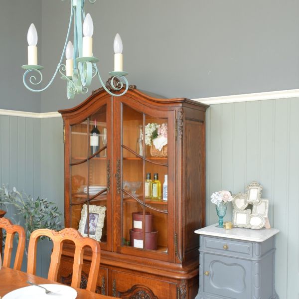 明日は野球のお茶当番で忙しいので、ちょっと早めに食事をするダイニングをコーディネートしました。 なんだか疲れがとれないので、気分だけでも上げよう!と選んだのはフレンチスタイルのダイニング。差し色にブルーグレー色のサイドキャビネットを入れてみました。 アクセントにもう一カ所、同じ色を入れるといい感じになるな・・・と、シャンデリアを吊るして完成。さぁ、明日も早起きガンバロウ~!