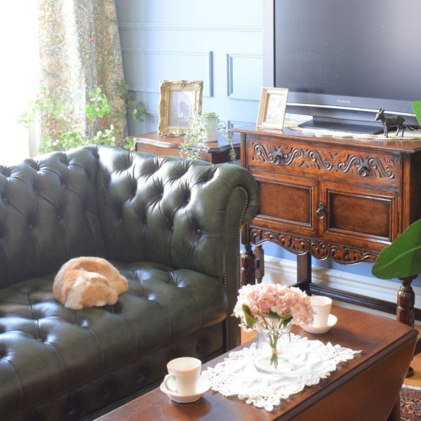 今日はとにかく大忙しの一日。朝から取引先との打ち合わせがあって、お昼からはゴルフのハーフコース。終わってから仕事をこなしてバンドの練習に向かい、早めに帰って末っ子のお迎え・・・ すっごくクタクタになるのを予測して、落ち着いてゆっくり休むんだったらやっぱりこれ!と、ジャコビアンスタイルのリビングダイニングをコーディネートしました。 まさに全てがジャコビアン!って感じのオーク材の家具でトータルコーディネートした中に、チェスターフィールドをアクセントで投入☆疲れを癒してもらおうと思います。