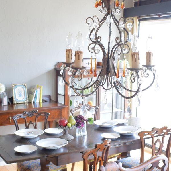 昨日の夜、急に次男が帰ってきたので大忙し。朝からお弁当とご飯を作ってお花のお稽古に行き、ゴルフの打ちっ放しに行ってから仕事・・・(苦笑)ということで、夜はゆっくりゴハンが食べたいなと思って気分があがるクラシックスタイルのお部屋を。 最近、さらに目が肥えたからなのか、シンプルな美しさに目がない私。細身のセティにトライポット脚のセンターテーブルをセッティング。 美しいガラスキャビネットとサイドボードと一緒に、優雅な気分を楽しむリビングダイニングになって、心が豊かになった感じがする~今日も一日、よく頑張りました(笑)
