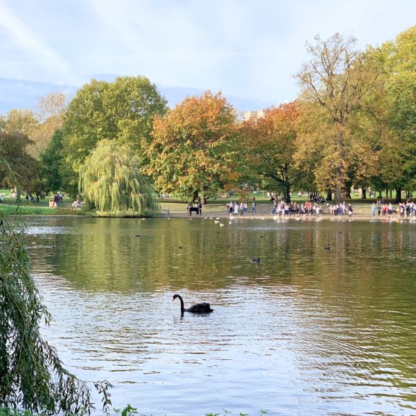 バッキンガム宮殿に行く途中にあるのが、ロンドンで一番古いロイヤルパーク「セント・ジェームズ・パーク」 「ロイヤル」が付いているので、ちょっと格式ばって聞こえますが、もともとは王様が狩りなどをしながら、のんびりと余暇を過ごした、王室専用の遊び場です。 今は誰でも自由に散策できる憩いの場になっているので、芝生に寝転んでお昼寝中の人も(笑) そして池で気持ちよさそうに泳いでいたのが・・・ブラックスワン!黒鳥!!とってもレアな黒鳥は、みんなの視線を釘付けにしていました☆
